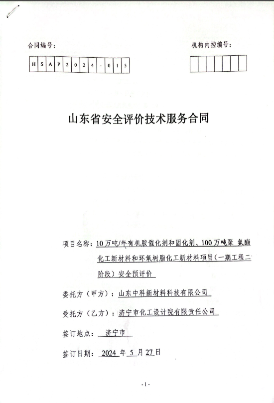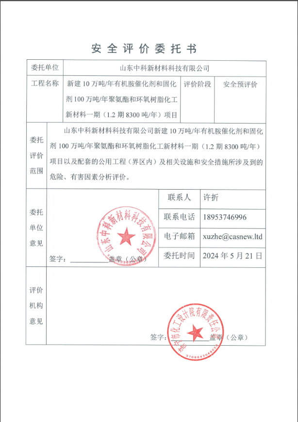 山东中科新材料科技有限公司新建10万吨/年有机胺催化剂和固化剂100万吨/年聚氨酯和环氧树脂化工新材料一期(1.2期8300吨/年)项目安全预评价